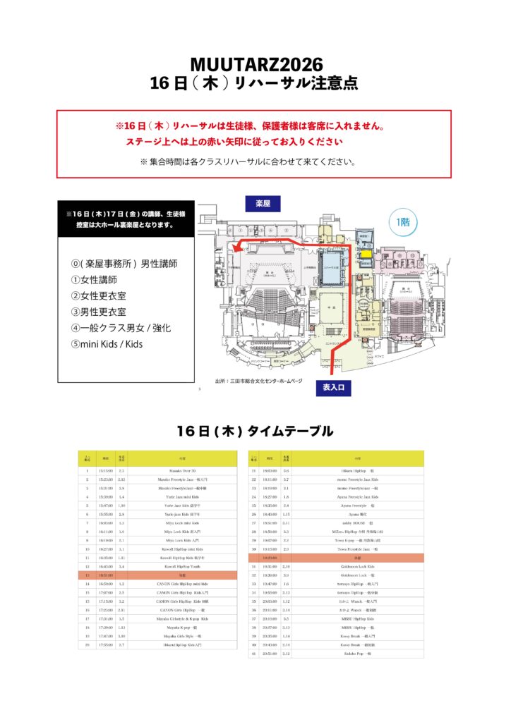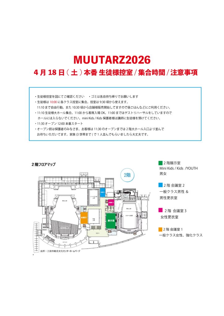 2026年4月2日 イベント MUUTARZリハーサルから本番まで注意事項 Tweet MUUTARZ2026 4月16日(木) リハーサル注意事項 MUUTARZ2026 4月17日(金) ゲネ注意事項 MUUTARZ2026 4月18日(土) 集合時間&生徒様控え室&注意事項 Tweet